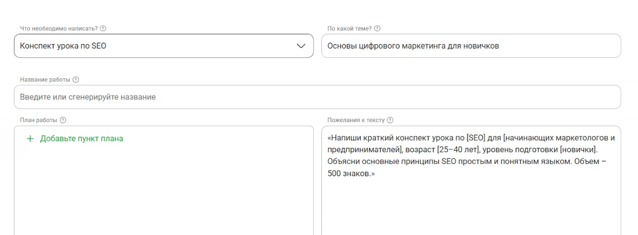 «Напиши краткий конспект урока по [SEO] для [начинающих маркетологов и предпринимателей], возраст [25–40 лет], уровень подготовки [новички]. Объясни основные принципы SEO простым и понятным языком. Объем – 500 знаков.»