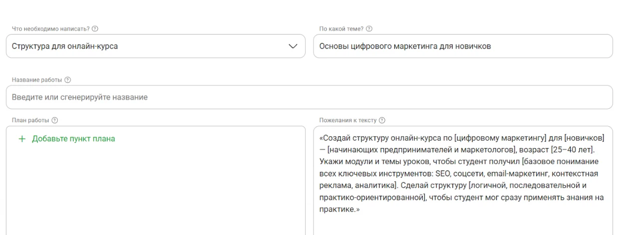 «Создай структуру онлайн-курса по [цифровому маркетингу] для [новичков] — [начинающих предпринимателей и маркетологов], возраст [25–40 лет]. Укажи модули и темы уроков, чтобы студент получил [базовое понимание всех ключевых инструментов: SEO, соцсети, email-маркетинг, контекстная реклама, аналитика]. Сделай структуру [логичной, последовательной и практико-ориентированной], чтобы студент мог сразу применять знания на практике.»